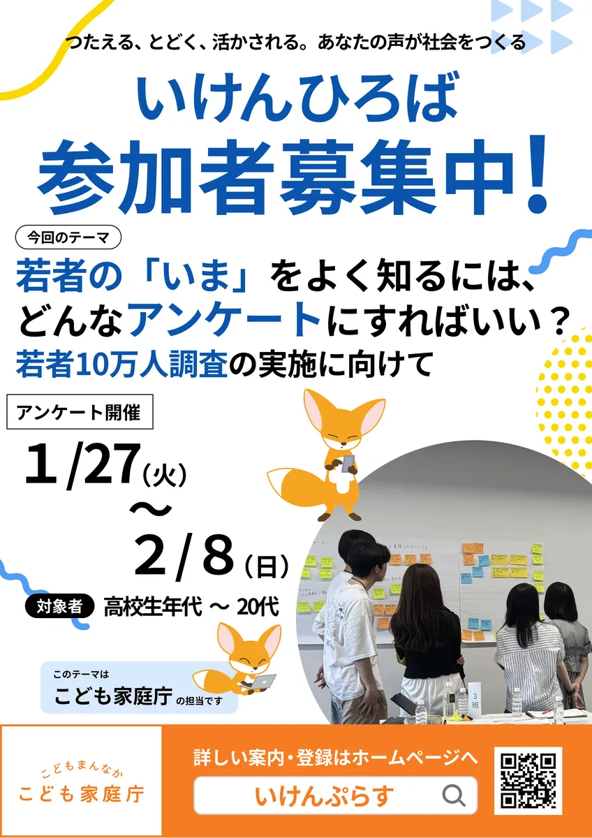 | テーマについて | 2026年に、全国の若者10万人を対象にしたアンケート調査を実施したいと考えています。 この調査では、迷っていること、チャレンジしたいこと等、若者の皆さんが日々の中で感じていることを広く聴いていきます。 どのような調査にしたら、若者の声をしっかりと聴くことができ、施策につながる調査にできるか、皆さんの意見を聴かせてください。 |