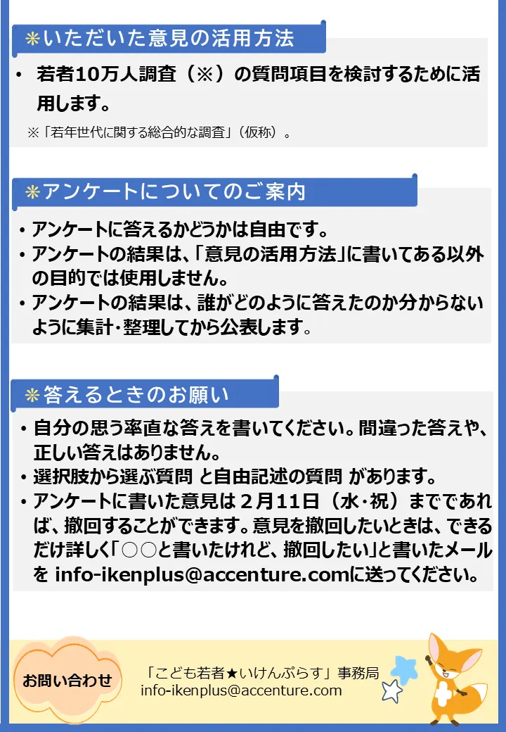 1/27(火)18:00頃に送付した告知メール(件名:「【こども若者★いけんぷらす】アンケートのお知らせ「若者の「いま」をよく知るには、どんなアンケートにすればいい?若者10万人調査の実施に向けて」(2/8(日)23:59まで)」)から回答することができます!