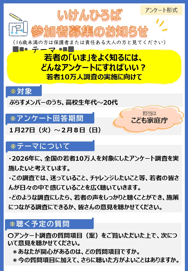 | 対象 | ぷらすメンバーのうち高校生年代~20代 ※いけんひろば(アンケート)回答期限4日前(2/4(水)23:59)までにいけんぷらすメンバー登録してくれた方が対象となります。 |