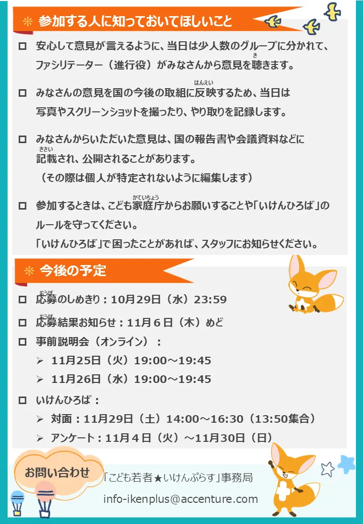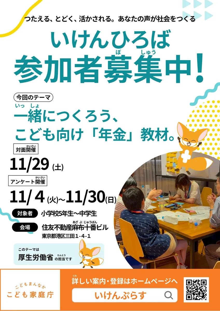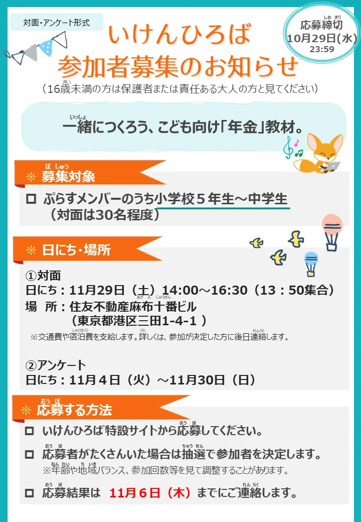 | 対象 | ぷらすメンバーのうち、小学校5年生~中学生の方 ※いけんひろば(対面)は、30名程度 ※いけんひろば(アンケート)は、回答期限4日前(11/25(火)23:59)までにいけんぷらすメンバー登録してくれた方が対象となります。 |