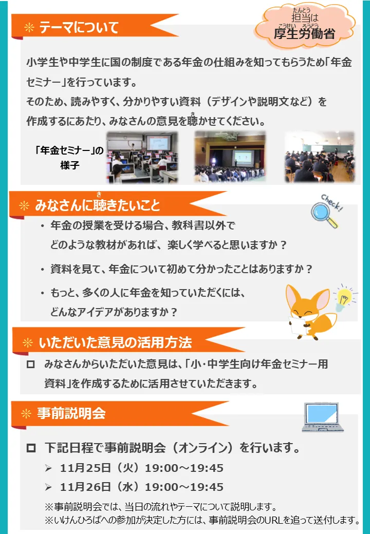 | テーマについて | 小学生や中学生から国の制度である年金の仕組みを知ってもらうために「年金セミナー」を行っています。 そのため、読みやすく、分かりやすい資料(デザインや説明文など)を作成するにあたり、みなさんの意見を聴かせてください。 |