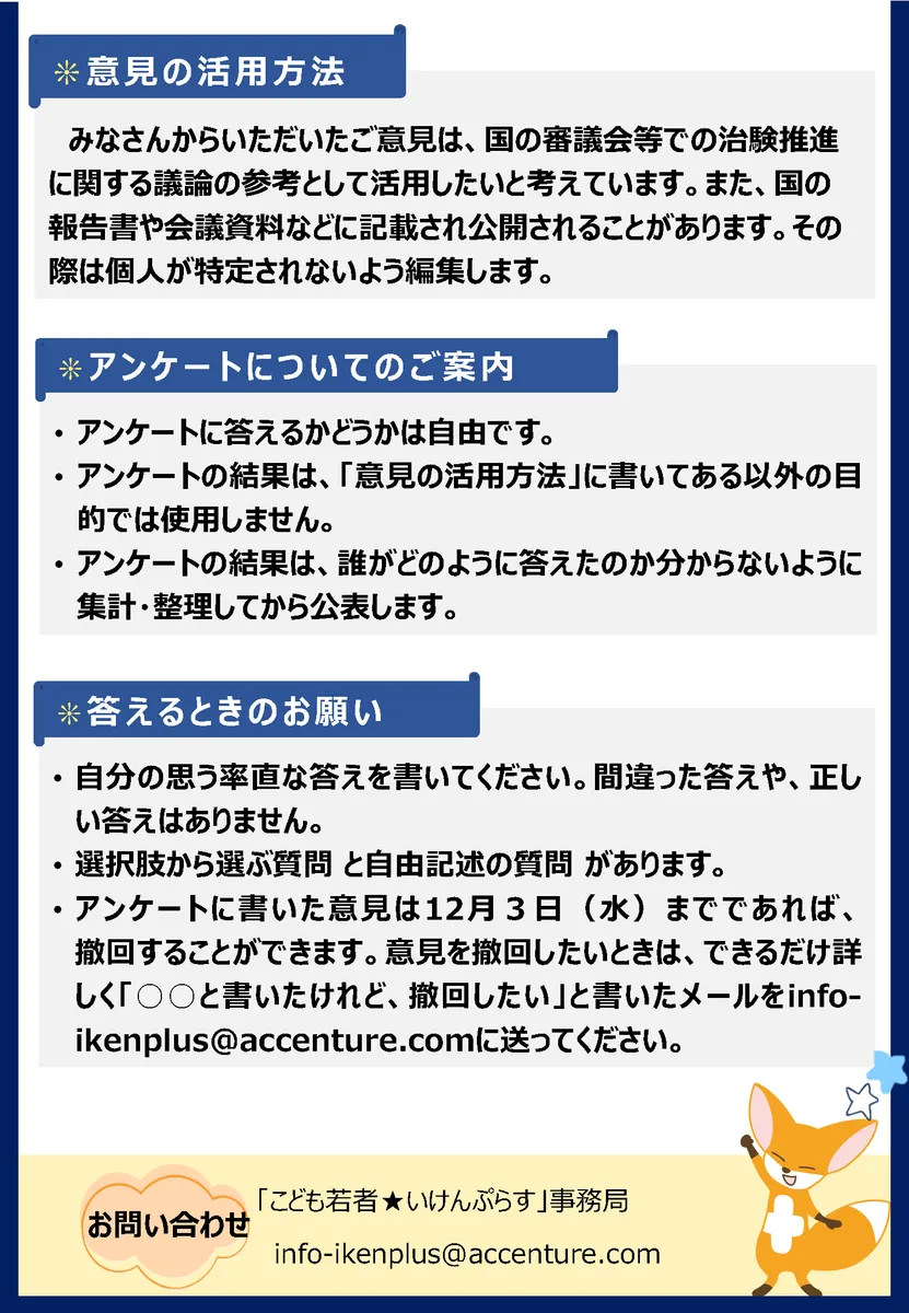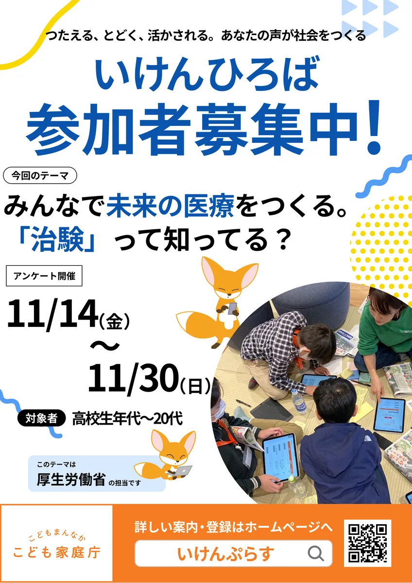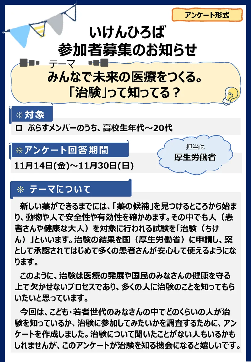 11/14(金)18:00頃に送付した告知メール(件名:「【こども若者★いけんぷらす】アンケートのお知らせ「みんなで未来の医療をつくる。「治験」って知ってる?」(11/30(日)23:59まで)」)から回答することができます!
