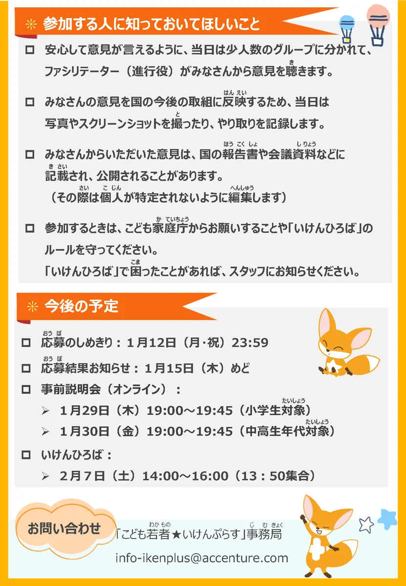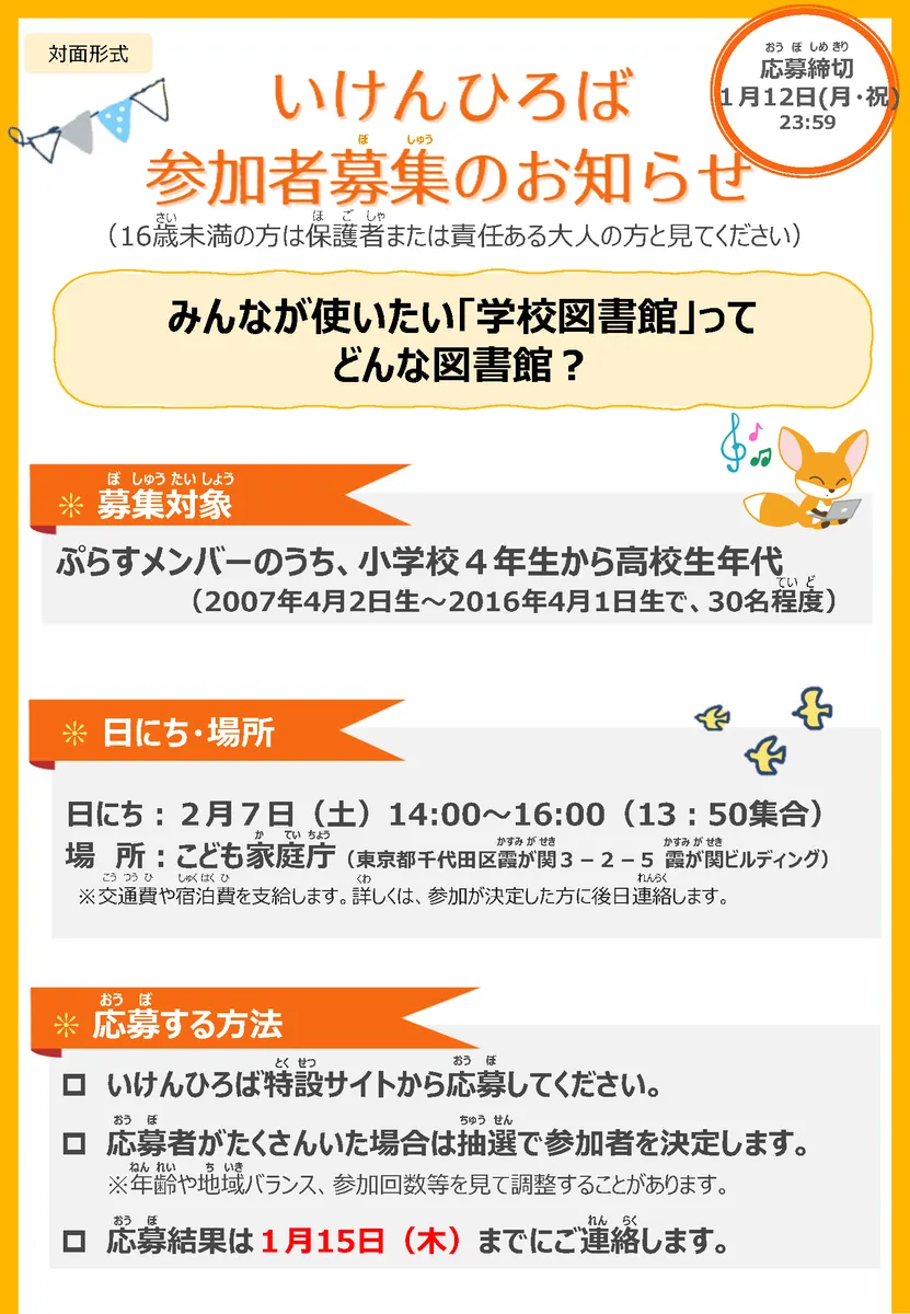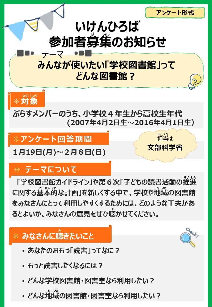 | 対象 | ぷらすメンバーのうち、小学校4年生~高校生年代の方 (2007年4月2日生~2016年4月1日生) ※いけんひろば(対面)は、30名程度。 ※いけんひろば(アンケート)は、回答期限4日前(2/4(水)23:59)までにいけんぷらすメンバー登録してくれた方が対象となります。 |