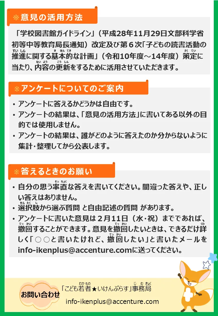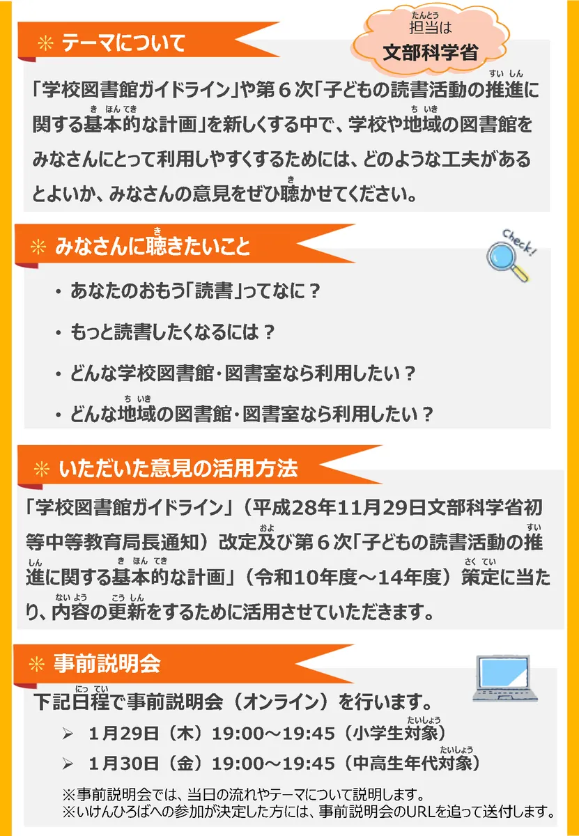 | テーマについて | 「学校図書館ガイドライン」や第6次「子どもの読書活動の推進に関する基本的な計画」を新しくする中で、学校や地域の図書館をみなさんにとって利用しやすくするためには、どのような工夫があるとよいか、みなさんの意見をぜひ聴かせてください。 |
