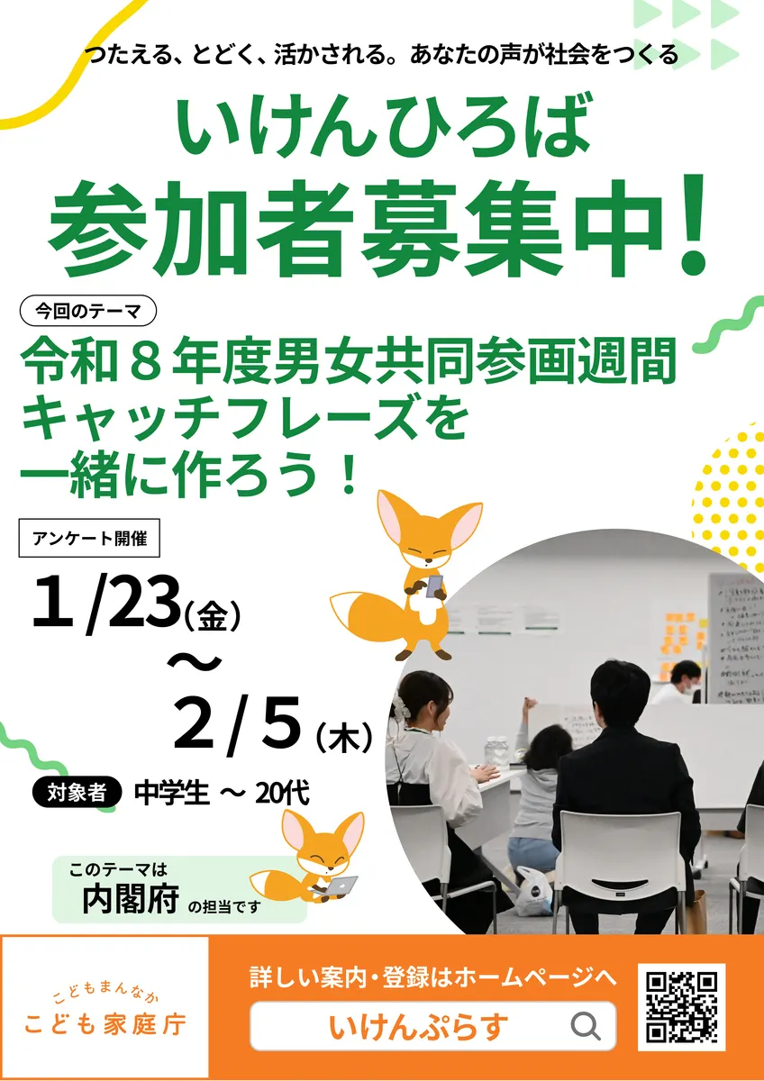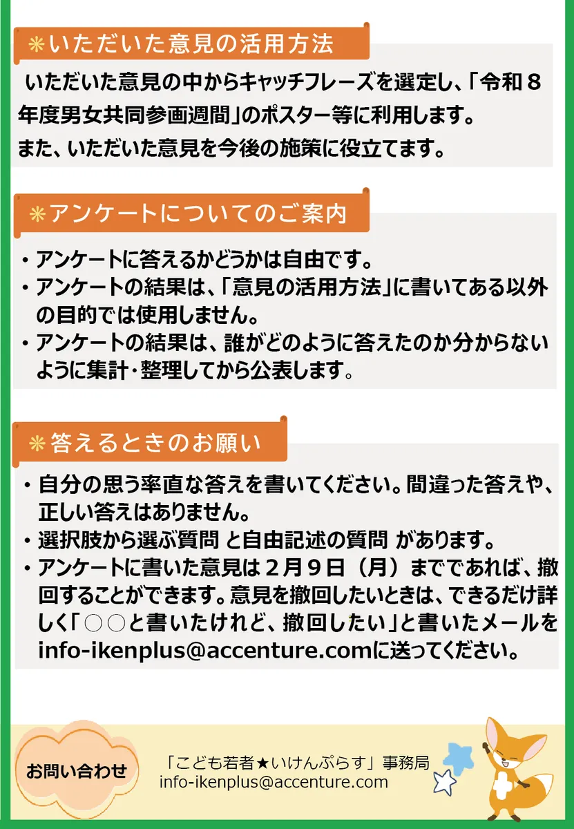 1/23(金)18:00頃に送付した告知メール(件名:「【こども若者★いけんぷらす】アンケートのお知らせ「令和8年度男女共同参画週間キャッチフレーズを一緒に作ろう!」(2/5(木)23:59まで)」)から回答することができます!