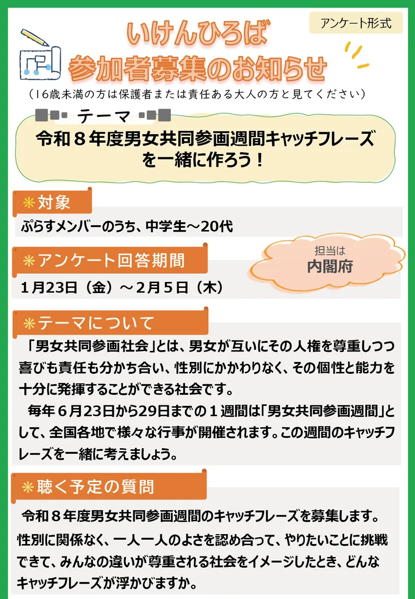 | 対象 | ぷらすメンバーのうち中学生~20代 ※いけんひろば(アンケート)回答期限4日前(2/1(日)23:59)までにいけんぷらすメンバー登録してくれた方が対象となります。 |