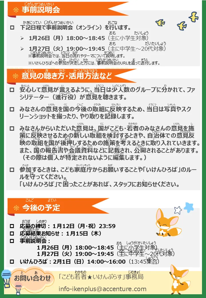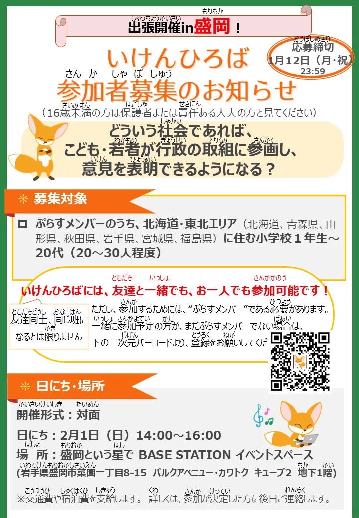 | 対象 | 北海道・東北エリア(北海道、青森県、山形県、秋田県、岩手県、宮城県、福島県)に住む小学校1年生~20代 20〜30人程度 |