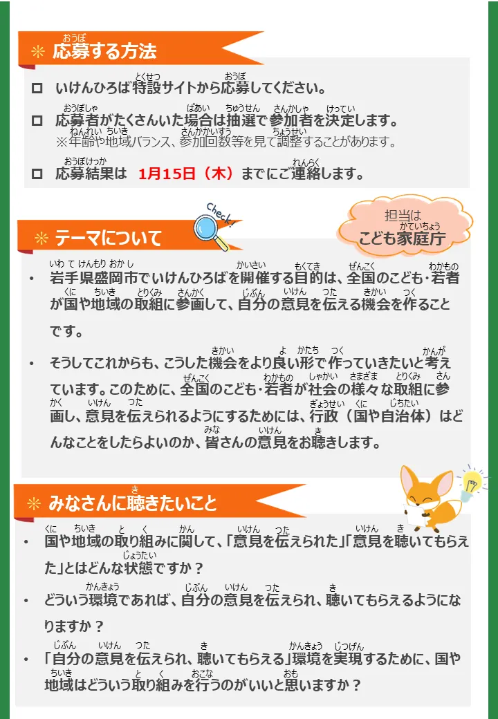 | テーマについて | 岩手県盛岡市でいけんひろばを開催する目的は、全国のこども・若者が国や地域の取組に参画して、自分の意見を伝える機会を作ることです。 そしてこれからも、こうした機会をより良い形で作っていきたいと考えています。このために、全国のこども・若者が社会の様々な取組に参画し、意見を伝えられるようにするためには、行政(国や自治体)はどんなことをしたらよいのか、皆さんの意見をお聴きします。 |
